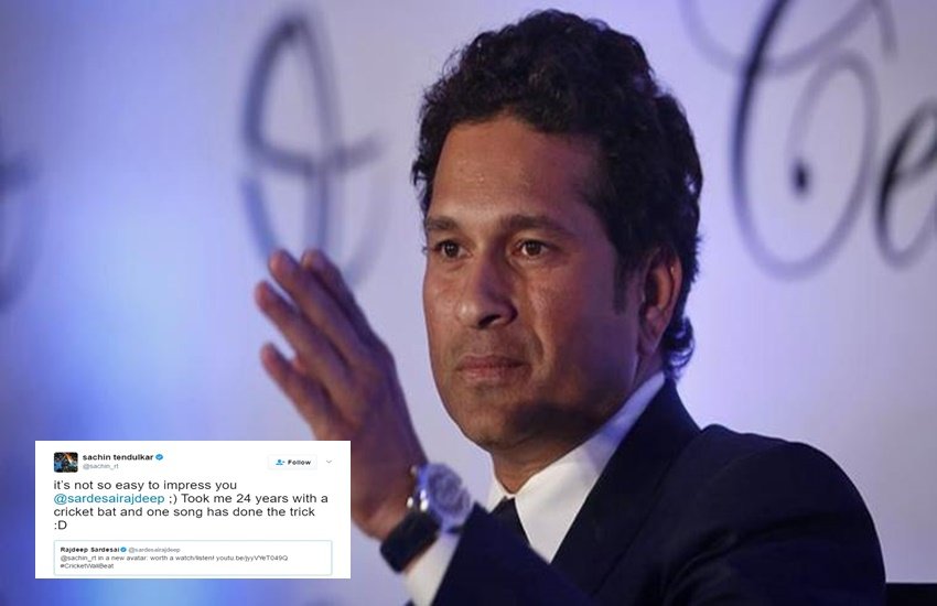 सचिन ने राजदीप के तारीफ भरे ट्वीट का जवाब बड़े ही मस्ती भरे अंदाज में दिया। सचिन ने राजदीप के ट्वीट पर रिप्लाइ करते हुए लिखा कि आपको इंप्रेस करना बड़ा ही कठिन काम है। मैंने 24 साल क्रिकेट खेला है..लेकिन जो काम मेरा बल्ला नहीं कर पाया वो मेरे एक गाने ने कर दिखाया।