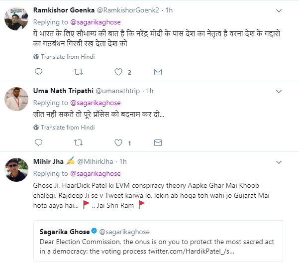 सागरिका के इस ट्वीट पर लोग उनपर ही टूट पड़े। कुछ लोग उनपर हार्दिक पटेल की चापलूसी करने के आरोप लगाने लगे तो कुछ लोग उनपर निजी हमले करने लगे। लोगों ने लिखा कि एक बेवकूफ कुछ भी लिख रहा है और दूसरा बेवकूफ चुनाव आयोग पर ही उंगली उठा रहा है।