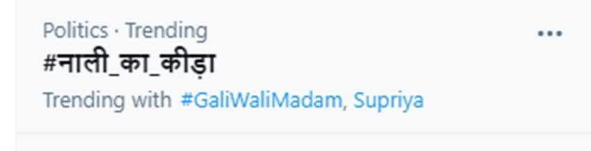 देखेत ही देखते सोशल मीडिया पर दो ट्रेंड चलने लगे। बीजेपी के समर्थकों ने #gaaliwalimadam ट्रेंड कराने लगे तो सुप्रिया श्रीनेत के समर्थन वाले यूजर्स ने #नाली_का_ कीड़ा ट्रेंड कराना शुरू कर दिया।