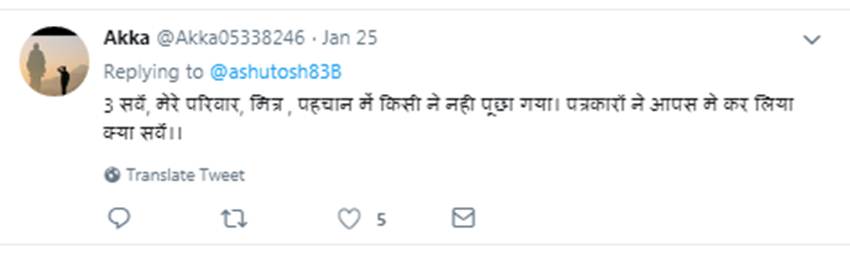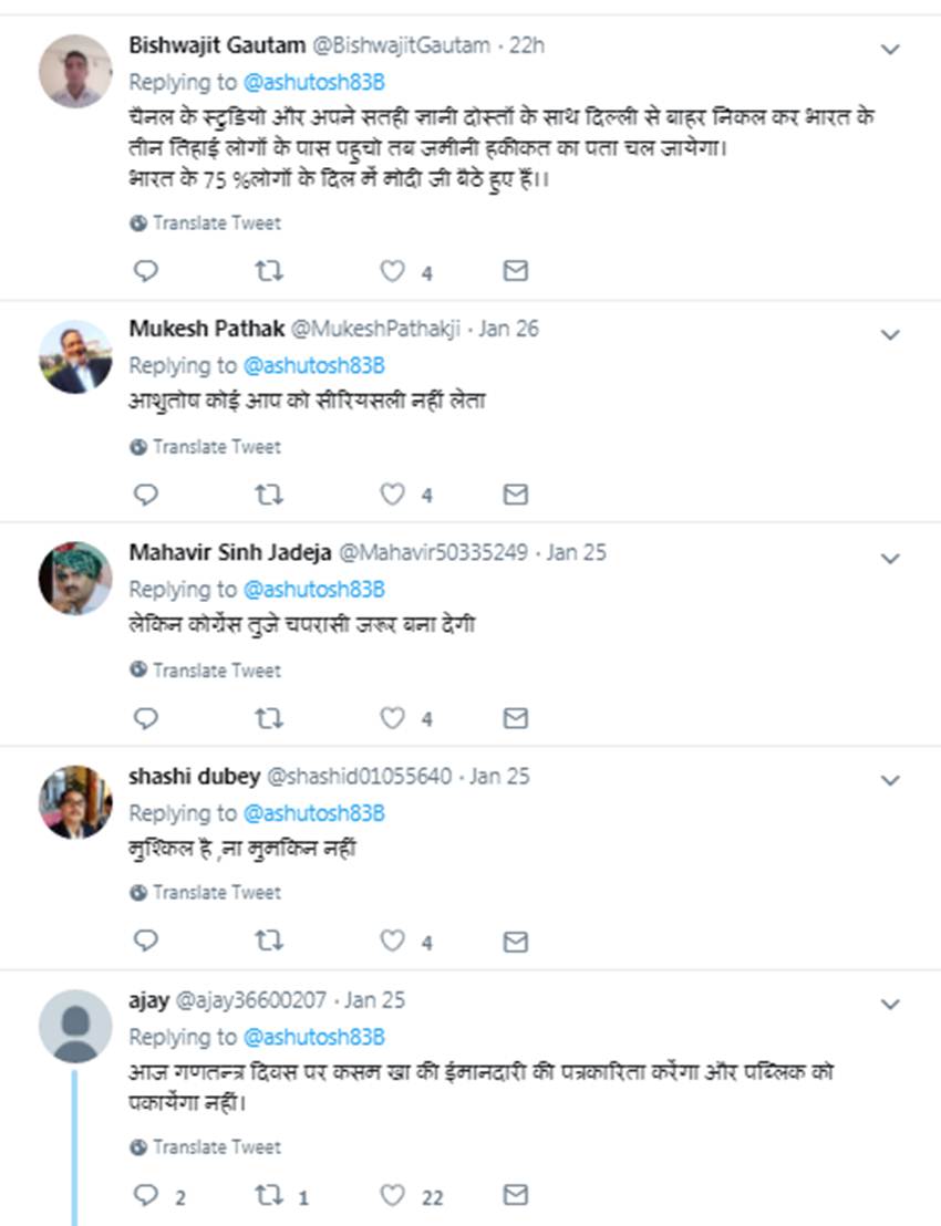 किसी शख्स ने आशुतोष को निशाने पर लिया, तो कोई इन सर्वों पर ही सवालिया निशान लगाते दिखा। देखें, आशुतोष के ट्वीट पर लोगों की प्रतिक्रियाएं: