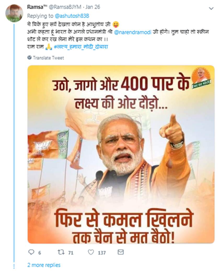 वरिष्ठ पत्रकार और आम आदमी पार्टी (आप) के पूर्व नेता आशुतोष एक ट्वीट के चलते हाल ही में सोशल मीडिया पर ट्रोल कर दिए गए। उन्होंने ट्वीट किया था, “तीन चुनाव सर्वे, अनुमान एक- नरेंद्र मोदी का 2019 में फिर प्रधानमंत्री बनना मुश्किल है।” इस पोस्ट में उन्होंने इंडिया टीवी, इंडिया टुडे और एबीपी न्यूज के चुनावी पोल्स का हवाला देते हुए आशंका जताई कि मोदी 2019 में पीएम की गद्दी पर नहीं बैठ पाएंगे।