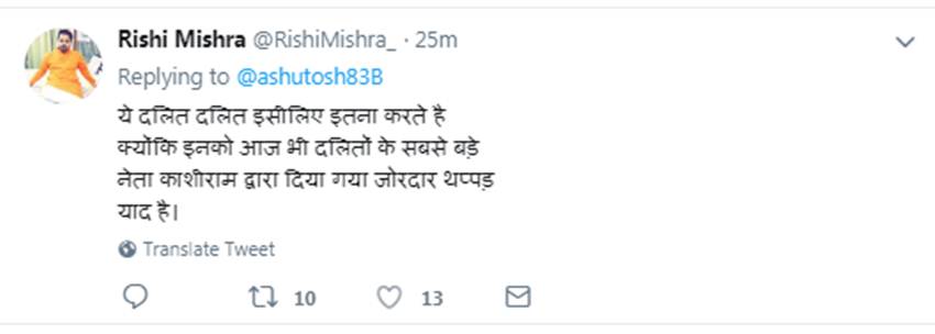 वरिष्ठ पत्रकार आशुतोष शनिवार (दो फरवरी, 2019) को बुरी तरह ट्रोल कर दिए गए। केंद्रीय अन्वेषण ब्यूरो (सीबीआई) के नए निदेशक ऋषि कुमार शुक्ला की नियुक्ति पर उन्होंने ट्वीट किया था। लिखा था कि शुक्ला जी तो हो गए सीबीआई निदेशक, कभी कोई दलित भी होगा? सोशल मीडिया यूजर्स इसी को लेकर उन पर उबल पड़े। लोग बोले, “कांशीराम को पता था कि आप घटिया काम करेंगे, लिहाजा उन्होंने तभी आपको थप्पड़ लगा दिया था।” वहीं, एक अन्य यूजर ने प्रश्न उठाया- आम आदमी पार्टी (आप) का प्रमुख कभी कोई दलित बनेगा?