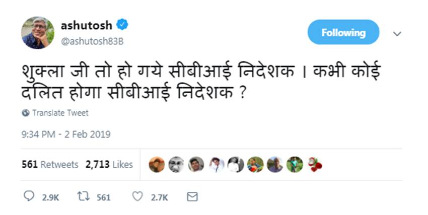 दरअसल, शनिवार (दो फरवरी) को प्रधानमंत्री नरेंद्र मोदी के नेतृत्व वाली चयन समिति ने शुक्ला को देश की सबसे बड़ी जांच एजेंसी के नए मुखिया के रूप में नियुक्त किया। पीएम मोदी और बीजेपी की आलोचना करने वाला एक धड़ा अक्सर यह आरोप लगाता रहा है कि मोदी सरकार सवर्णों के लिए ‘सॉफ्ट कॉर्नर’ रखती है। वह अगड़ी जातियों के लोगों को बढ़ावा देती है। आशुतोष ने इसी बाबत बिना किसी के नाम का जिक्र किए ट्वीट किया। सवाल दागा, “शुक्ला जी तो हो गए सीबीआई निदेशक। कभी कोई दलित होगा?”