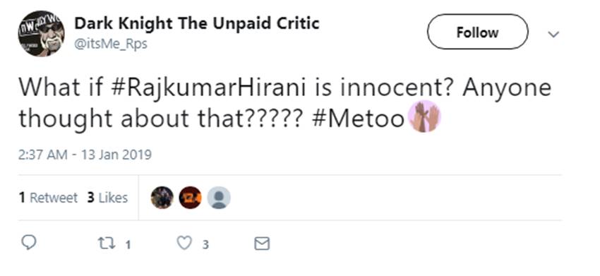हालांकि इधर राजकुमार हिरानी ने इन सभी आरोपों से इनकार किया है। राजकुमार हिरानी के वकील आनंद देसाई ने इन सभी आरोपों को बेबुनियाद बताते हुए इसे झूठा करार दिया है। आनंद देसाई ने कहा है कि लड़की द्वारा लगाए गए सभी आरोप दुर्भावना से प्रेरित हैं। निर्देशक राजकुमार हिरानी पर आरोप लगने के बाद ट्विटर पर कई लोगों ने अपनी प्रतिक्रिया भी दी है।