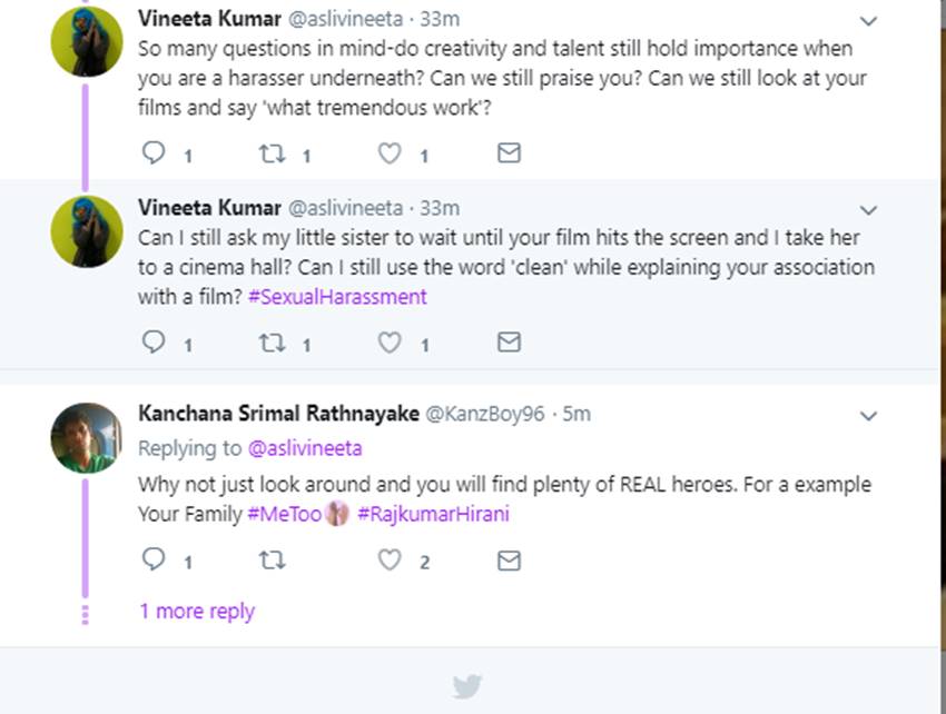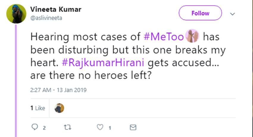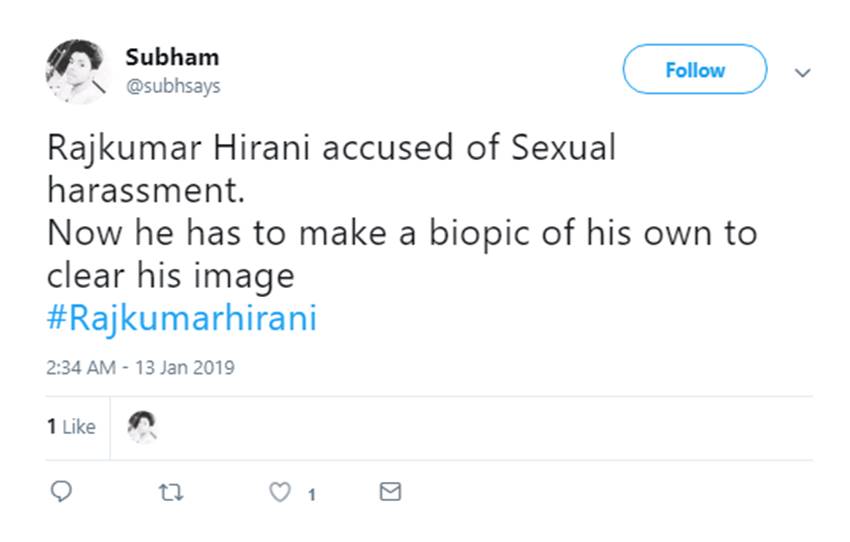 हालांकि इधर राजकुमार हिरानी ने इन सभी आरोपों से इनकार किया है। राजकुमार हिरानी के वकील आनंद देसाई ने इन सभी आरोपों को बेबुनियाद बताते हुए इसे झूठा करार दिया है। आनंद देसाई ने कहा है कि लड़की द्वारा लगाए गए सभी आरोप दुर्भावना से प्रेरित हैं। निर्देशक राजकुमार हिरानी पर आरोप लगने के बाद ट्विटर पर कई लोगों ने अपनी प्रतिक्रिया भी दी है।