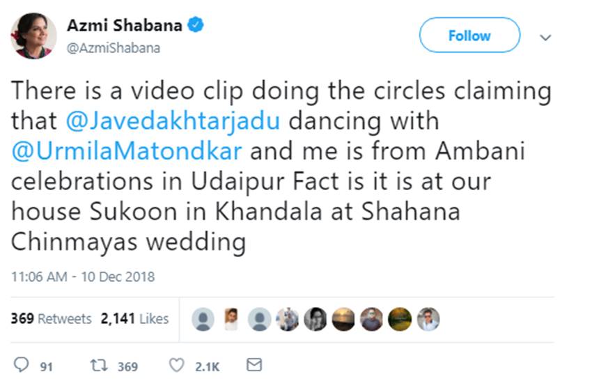 लेकिन अब जावेद अख्तर की पत्नी शबाना आजमी ने सामने आकर इस वीडियो की सच्चाई बयां की है। बीते मंगलवार को मशहूर अदाकार शबाना आजमी ने ट्विटर पर लिखा कि ‘कुछ लोग इस वीडियो के जरिए यह कह रहे हैं कि अंबानी के कार्यक्रम में उर्मिला के साथ जावेद ने किया। सच्चाई यह है कि यह वीडियो मेरे घर यानी खंडाला स्थित सुकून का है। यह वीडियो शहाना चिन्मय की शादी का है।’ शबाना आजमी ने साफ किया है कि यह वीडियो ईशा अंबानी की वेडिंग से पूर्व किसी कार्यक्रम का नहीं है।