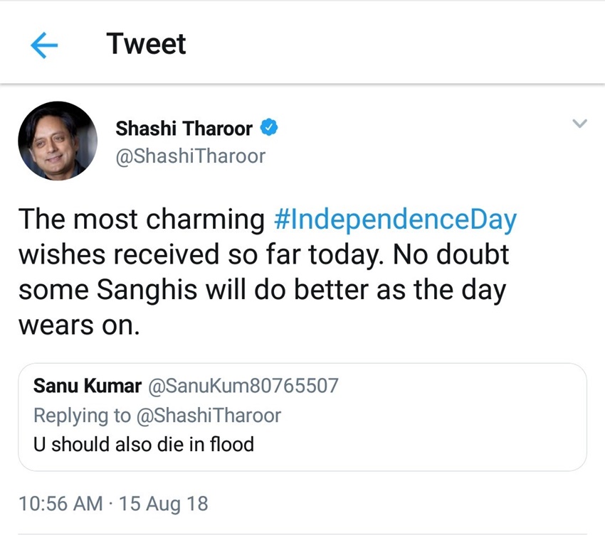 एक ट्वीटर यूजर ने कांग्रेस नेता शशि थरूर को ट्वीट कर कहा कि, “आपको भी बाढ़ में मर जाना चाहिए।” यूजर के इस कमेंट पर रिट्वीट करते हुए कहा कि, “स्वतंत्रता दिवस के अवसर पर मुझे सबसे आकर्षक शुभकामना मिली। इसमें कोई संदेह नहीं है कि जैसे-जैसे दिन आगे बढ़ेगा संघी और अच्छा करेंगे।” दरअसल, शशि थरूर केरल में बाढ़ की स्थिति का जायजा लेने गए हैं। उन्होंने ट्वीट कर बताया, “मैं इस समय तिरुवनंतपुरम के आसपास के क्षेत्र का मुआयना कर रहा हूं। मंत्री कदकंपल्ली सुरेंद्रन, महापौर प्रसंत और कलेक्टर वासुकी ने स्थिति का जायजा लिया। आज भी खराब बारिश की उम्मीद है।”