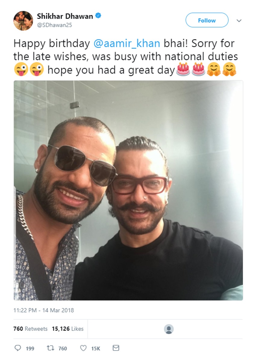 बॉलीवुड के मशहूर अभिनेता आमिर खान ने बुधवार (14 मार्च) को अपना जन्मदिन मनाया। इस मौके पर उन्हें बधाई देने वालों में नेता, अभिनेता, सामाजिक कार्यकर्ता व खिलाड़ी शामिल रहे। इसके अलावा उनके प्रशंसकों ने भी विभिन्न सोशल मीडिया प्लेटफॉर्म पर आमिर को जन्मदिन की शुभकामनाएं दीं। भारतीय क्रिकेट टीम के ओपनर शिखर धवन को बधाई देने में जरा देर हो गई। धवन ने बुधवार रात 11.22 बजे ट्वीट किया, ”हैप्पी बर्थडे आमिर खान भाई! देर से विश करने के लिए सॉरी, नेशनल ड्यूटी में बिजी था। उम्मीद है आपका दिन शानदार रहा होगा।” धवन ने पोस्ट के संग अपनी और आमिर की एक सेल्फी भी अपलोड की।