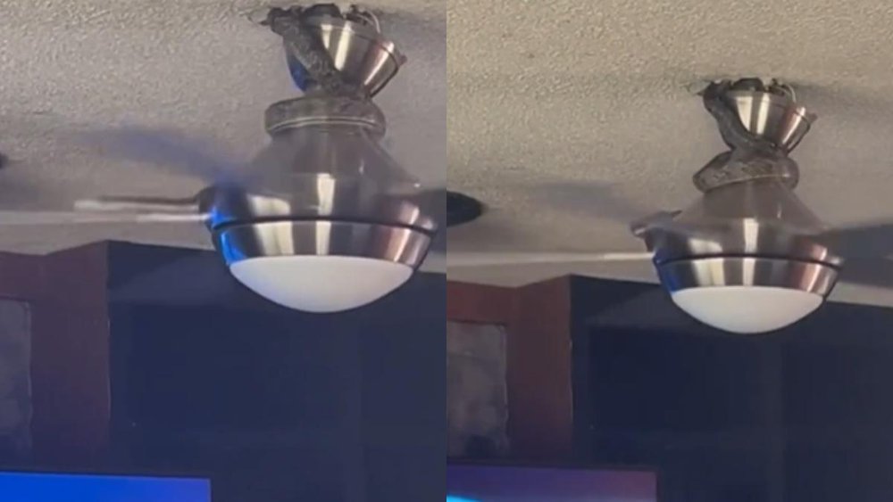 वीडियो में देखा जा सकता है कि एक सीलिंग फैन के ऊपर एक सांप है। सांप चलते पंखे से नीचे उतरने की कोशिश करता है लेकिन वह पंख से टकराने की वजह से नीचे नहीं उतर पा रहा है। एक शख्स आराम से सांप का वीडियो रिकॉर्ड कर रहा होता है। इसी दौरान सांप पंखे से उसी जगह पर गिरता है जहां से शख्स वीडियो बना रहा था।