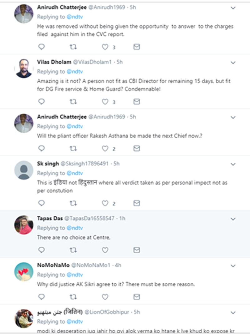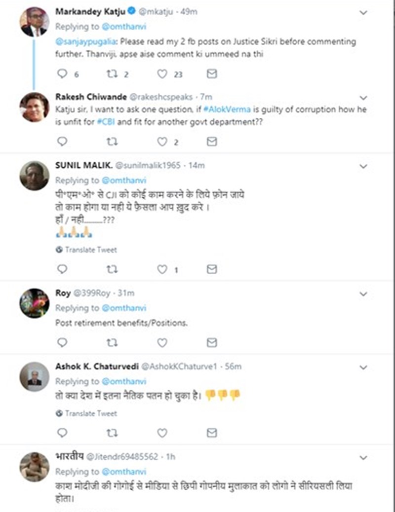 आलोक वर्मा के तबादले पर सोशल मीडिया में तमाम तरह की चर्चाएं हो रही हैं। कुछ लोग सरकार के फैसले को सही ठहरा रहे हैं तो कुछ सरकार की मंशा पर सवाल उठा रहे हैं। कई लोग पूछ रहे हैं कि अगर आलोक वर्मा भ्रष्ट और नाकाबिल थे तो वो एक पद के लिए अनफिट और दूसरे के लिए फिट कैसे हो सकते हैं। एक यूजर ने लिखा है, एक पद के लिए भ्रष्टाचार का आरोप कैसे लगाया जा सकता है और दूसरे के लिए नहीं? एक अन्य यूजर ने लिखा है, “यह कैसा तंत्र है कि एक व्यक्ति पांच दिन पहले सीबीआई निदेशक पद के लिए उपयुक्त रहता है और पांच दिन बाद भ्रष्ट होकर अनुपयुक्त।” इस बीच रिटायर्ड जज जस्टिस काटजू ने जस्टिस एके सीकरी का पक्ष लिया है।