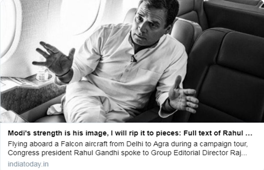 इंडिया टुडे के हवाले से बताया गया है कि राहुल गांधी ने कहा- प्रधानमंत्री नरेंद्र मोदी की ईमेज ही उनकी ताकत है..मैं इसेे तहस नहस कर दूंगा। राहुल गांधी का ये बयान भी सोशल मीडिया में बहस का कारण बना हुआ है। एक यूजर ने लिखा कि राहुल गांधी की सिर्फ चाहत है इसलिए वो मोदी की छवि धूमिल करेंगे। मतलब राहुल गांधी जोकर की तरह है जिसका मकसद सिर्फ दुनिया को जलते देखना है।