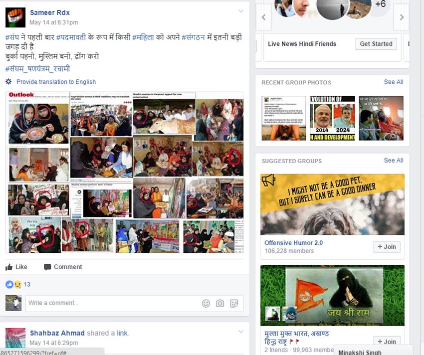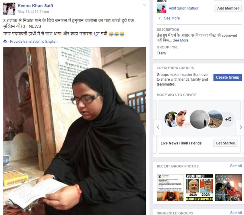 सोशल मीडिया पर 10 मई की एक तस्वीर शेयर करते हुए लिखा जा रहा है कि इसमें बुर्का पहनी एक महिला जो हनुमान चालीसा पढ़ रही है उसने अपने हाथ में कलावा बांधा है। ऐसी तस्वीरें शेयर करने वाले यूजर्स लिख रहे हैं कि इस महिला का नाम पद्मावती है और ये हिंदू है। इस महिला की दूसरी तस्वीरें भी यूजर्स सोशल साइट पर शेयर कर रहे हैं जिसमें वो अन्या देवी देवताओं की पूजा भी कर रही हैं।
