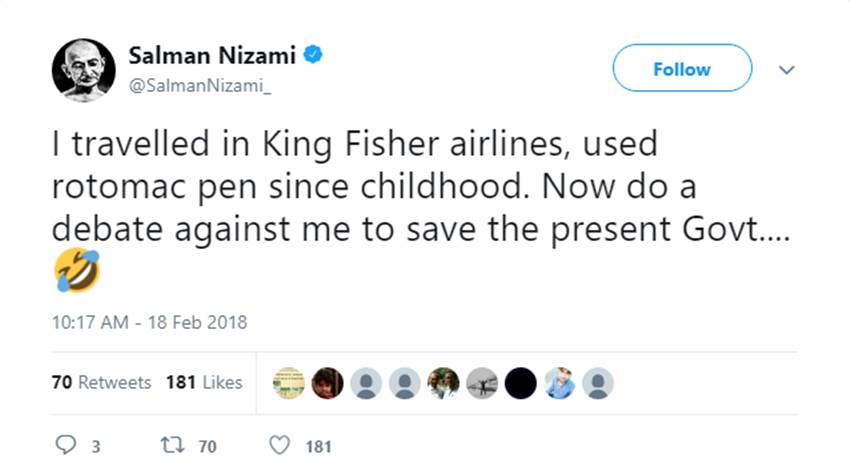 पंजाब नेशनल बैंक का 1100 करोड़ से ज्यादा का लोन न चुकाने के आरोपी नीरव मोदी देश से फरार हो चुके हैं। नीरव के ‘किस्से’ अभी सही से उजागर भी नहीं हुए थे कि ऐसा ही एक और मामला सामने आ गया। रोटोमैक कंपनी पर बैंकों के 800 करोड़ से ज्यादा की रकम न चुकाने का आरोप है। कंपनी के एमडी विक्रम कोठारी से सोमवार को पूछताछ हुई। सीबीआई और ईडी ने इस मामले में छापेमारी और पूछताछ की है। रोटोमैक कंपनी के पेन किसी जमाने में बहुत मशहूर हुआ करते थे। इसका टैगलाइन था- लिखते लिखते लव हो जाए। रविवार को ऐसी खबरें आईं कि रोटोमैक कंपनी के कोठारी भी नीरव की तरह देश छोड़कर फरार हो चुके हैं। हालांकि, कोठारी ने मीडिया के सामने आकर सफाई दी कि वह कानपुर में ही हैं। इसके बाद, रोटोमैक को लेकर भी सोशल मीडिया पर कई तरह के जोक्स और मीम्स वायरल हो गए। इन जोक्स में कंपनी से लेकर मोदी सरकार तक पर निशाना साधा गया है। बता दें कि नीरव के अमेरिका भागने के बाद टि्वटर पर ‘फाइंडिंग नीमो’ ट्रेंड करने लगा था। इस हैशटैग के साथ लोगों ने कई मजेदार जोक्स शेयर किए थे।