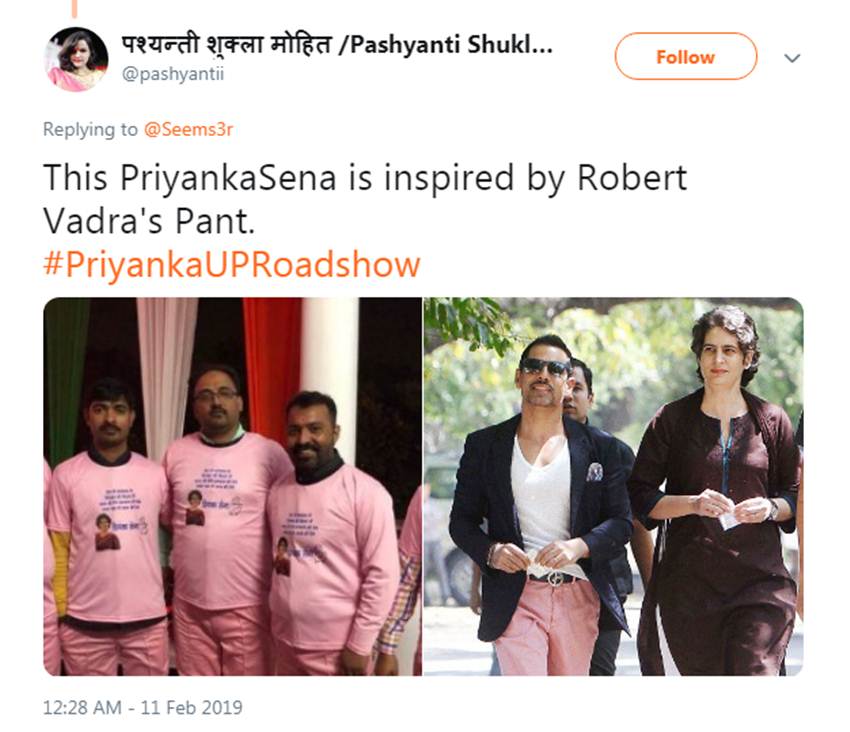 उत्तर प्रदेश कांग्रेस महासचिव प्रियंका गांधी वाड्रा के नाम पर बनी प्रियंका सेना सोमवार (11 फरवरी, 2019) को ट्रोल्स के निशाने पर आ गई। राजधानी लखनऊ में एक तरफ प्रियंका का रोडशो था। वहीं, दूसरी तरफ सोशल मीडिया यूजर्स प्रियंका सेना और उसके कार्यकर्ताओं के मजे ले रहे थे। टि्वटर पर लोग टेक्स्ट, फोटो, वीडियो और मजेदार मीम के जरिए न केवल प्रियंका सेना के मजे ले रहे थे, बल्कि प्रियंका के पति रॉबर्ट वाड्रा के कपड़ों पर भी चुटकी ले रहे थे। ट्रोल्स #pappuaurpinkikiparty और #pinksena के साथ ये सारी चीजें पोस्ट कर रहे थे। किसी ने प्रियंका सेना को ‘पिंकी सेना’ बताते हुए कहा कि इसकी ड्रेस जीजा जी (वाड्रा) से प्रेरित है, जबकि एक यूजर ने लिखा- यह ड्रेस बेहद बचकाना है।