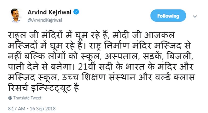 हुआ यूं कि केजरीवाल ने रविवार (16 सितंबर) को एक ट्वीट किया। लिखा, “राहुल जी मंदिरों में घूम रहे हैं। मोदी जी आजकल मस्जिदों में घूम रहे हैं। राष्ट्र निर्माण मंदिर-मस्जिद से नहीं बल्कि लोगों को स्कूल, अस्पताल, सड़कें, बिजली और पानी देने से होगा। 21वीं सदी के भारत के मंदिर और मस्जिद स्कूल, उच्च शिक्षण संस्थान और विश्व स्तरीय शोध संस्थान हैं।”