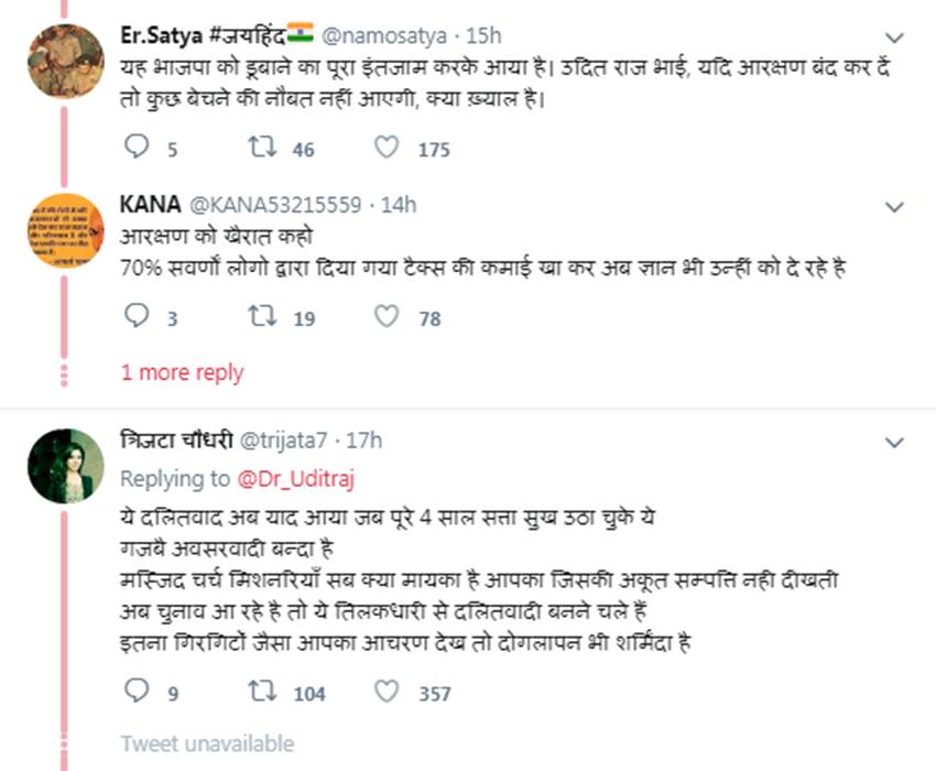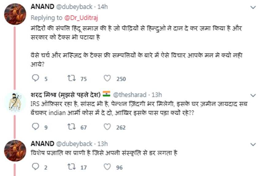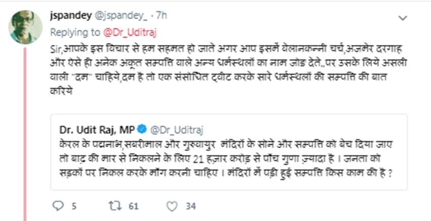 भारतीय जनता पार्टी (बीजेपी) के सांसद डॉ.उदित राज ने पूछा है कि मंदिरों में पड़ी संपत्ति किस काम की है? सलाह देते हुए वह आगे बोले कि उसे बेच दिया जाना चाहिए। सोशल मीडिया पर उनकी इसी टिप्पणी पर लोगों ने उन्हें लानत भेजना शुरू कर दिया। लोग झल्लाते हुए सांसद को टैग कर पूछने लगे, “आप मस्जिदों और गिरजाघरों की संपत्तियों के बारे में भी अपने विचार साझा करें।” वहीं, कुछ ने उन्हें हिंदू विरोधी बताते हिदायत दे डाली कि सांसद अपनी जमीन-जायदाद भारतीय सेना के कोष में दे दें।