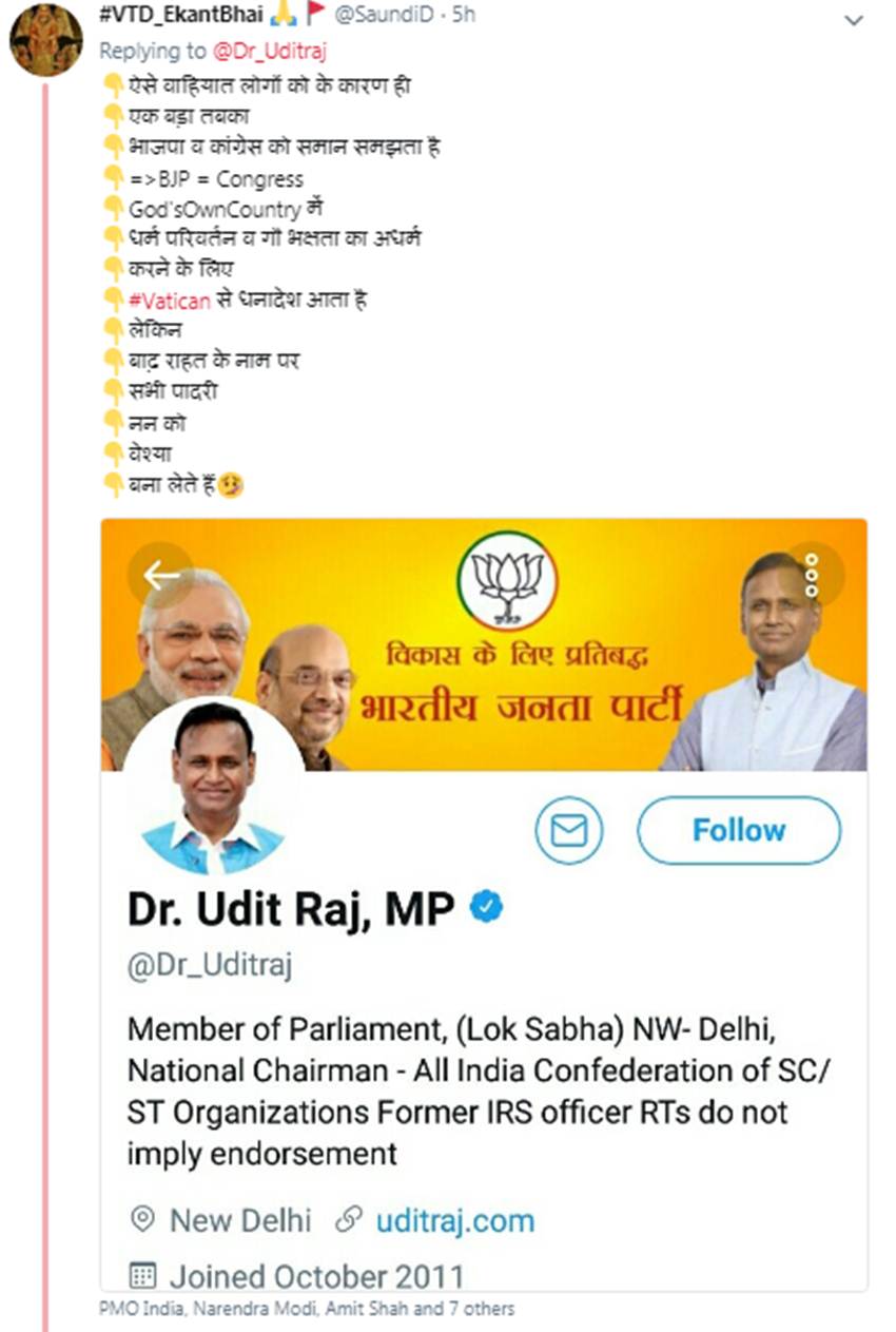 राज, उत्तरी पश्चिमी दिल्ली से लोकसभा सांसद हैं। वह इसके अलावा ऑल इंडिया कनफेडरेशन ऑफ एससी/एसटी ऑर्गनाइजेशंस के राष्ट्रीय अध्यक्ष भी हैं। उनकी हालिया टिप्पणी केरल में बीते दिनों आई भीषण बाढ़ के राहत और बचाव कार्य को लेकर आई। आपको बता दें कि केरल में आए कुदरत के उस कहर के कारण तकरीबन 400 लोगों की जान चली गई थी, जबकि तीन लाख से अधिक लोग बेघर हो गए थे।