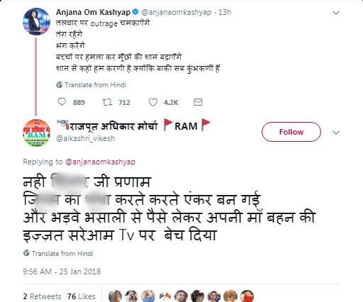 अंजना ओम कश्यप के इस ट्वीट को देख करणी सेना के समर्थक भड़क गए और गालियां देने लगे। ये लोग बोलने लगे कि हमें लगता था कि तुम भी क्षत्रिय हो लेकिन तुम्हारे ट्वीट ने हमारी गलतफहमी दूर कर दी। लोग बेहद अपमानजनक बातें लिखते हुए सारी हदें पार करने लगे। हालांकि बहुत से यूजर्स ऐसे भी थें जो ये इस तरह से एंकर को गलियां देने का विरोध कर रहे थे। ऐेसे लोगों ने कही कि इस तरह से अपनी बात रखने के लिए अंजना को गालियां देना बहुत गलत है।