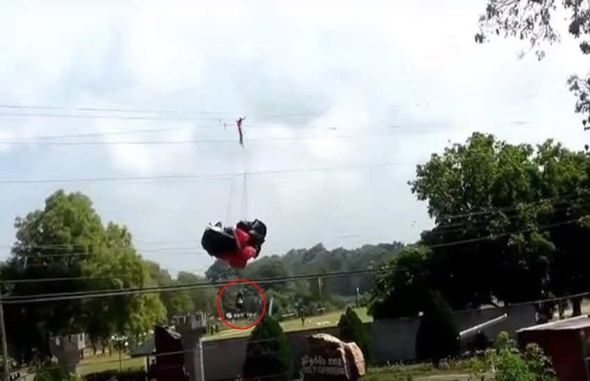 श्रीलंका में एक बेहद डरावनी घटना देखने को मिली है, जहां पर आर्मी की ट्रेनिंग के दौरान एक महिला का पैराशूट बिजली की हाई वॉलटेज तारों में जा अटका, लेकिन गनीमत यह रही कि महिला को सुरक्षित बचा लिया गया। इस घटना का वीडियो सोशल मीडिया पर वायरल हो चुका है, जिसे काफी लोग शेयर कर चुके हैं। प्राप्त जानकारी के अनुसार कदुरुगासरा स्थित मई माह के शुरुआत में श्रीलंकाई आर्मी अपने नए सैनिकों को सैन्य अभ्यास सीखा रही थी। इस सैन्य अभ्यास में कई सैनिक पैराशूट के द्वारा कार्रवाही करने का अभ्यास कर रहे थे। इस वीडियो में साफ देखा जा सकता है कि कैसे महिला सैनिक ऊंचाई पर बड़े ही आराम से उड़ रही होती है कि तभी उसका संतुलन बिगड़ने लगता है।