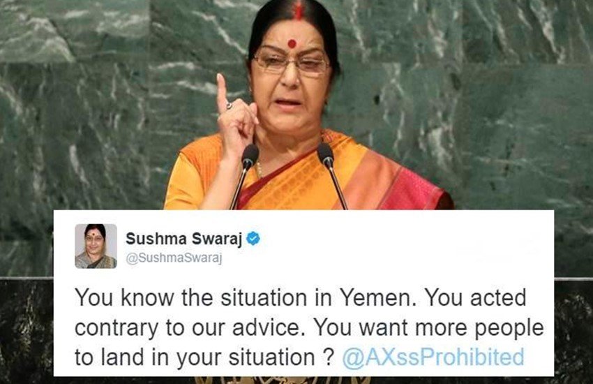 दुनिया के तमाम हिस्सों में फंसे भारतीय को ट्विटर के जरिये मदद पहुंचाने में विदेश मंत्री सुषमा का कोई जवाब नहीं है। चाहे लोगों को युद्धग्रस्त क्षेत्र से बचा कर वापस लाने की बात हो या फिर वक़्त पर वीजा मुहैया कराने का मसला हो सुषमा हमेशा आगे रहती हैं। लेकिन अगर कोई मदद की आड़ में अनुचित फायदा उठाने की कोशिश करता है तो सुषमा ऐसे लोगों को फटकार लगाने से भी नहीं चूकतीं। इस बार यमन में फंसे इंडियन नेवी के एक अधिकारी को सुषमा ने ऐसे ही फटकार लगाई।