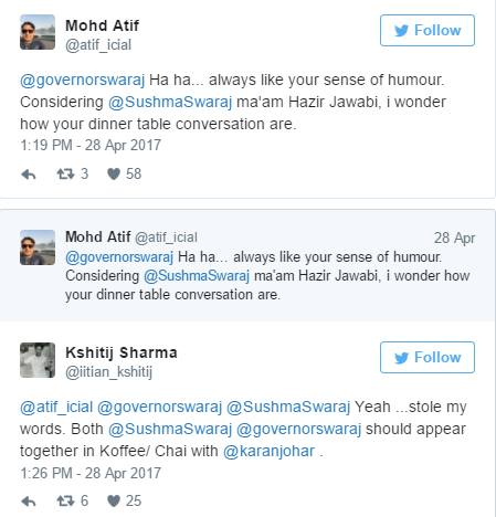 लोगों ने खूब लिए मजे: गवर्नर स्वराज का यह ट्वीट लोगों को खूब पसंद आया। एक यूजर मोहम्मद आतिफ ने लिखा, मुझे आपका सेंस अॉफ ह्यूमर बहुत पसंद है और सुषमा मैम की हाजिर जवाबी, सोचता हूं आपकी डिनर टेबल पर बातचीत कैसी होती होगी। एक यूजर क्षितिज ने लिखा, आपने मेरे शब्द चुरा लिए, आप दोनों को कॉफी विद करन में जाना चाहिए।