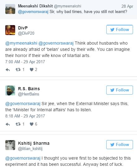 चार दशकों से भारतीय राजनीति में सक्रिय स्वराज ने कहा कि इससे काफी मिडिल क्लास महिलाओं के लिए दरवाजे खुल सकते हैं, जो पारिवारिक दवाब में पिस जाती हैं। कई लोगों ने उनके इस प्रस्ताव की तारीफ की, लेकिन उनके पति स्वराज कौशल के हास्य व्यंग्य ने सबको चौंका दिया। एचटी की न्यूज रिपोर्ट को शेयर करते हुए सुषमा स्वराज के पति ने लिखा..बुरा समय आगे है। शायद उनका इशारा मार्शल आर्ट्स की ओर था। उनके मजेदार जवाब पर ट्विटर यूजर्स भी अपनी हंसी नहीं रोक सके। उनके इस ट्वीट को 2000 बार री-ट्वीट किया गया और 3500 लोगों ने इसे लाइक किया है।