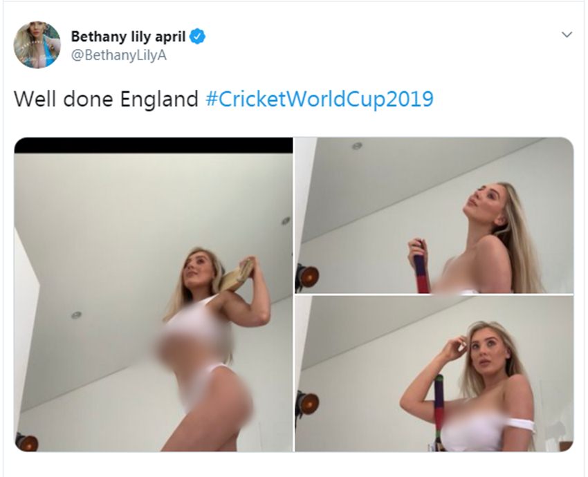 इस ब्रिटिश मॉडल का नाम है बेथनी लिली अप्रिल। 15 जुलाई को बेथनी ने अपनी तीन तस्वीरें अपने ट्विटर अकाउंट से अपलोड कीं। इन तस्वीरों में वह क्रिकेट बैट के साथ स्ट्रिपिंग करती नजर आ रही हैं। तस्वीरें शेयर करते हुए बेथनी ने लिखा- वेल डन इंग्लैंड।