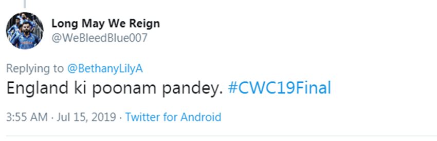 बेथनी के ट्वीट ने इंडियन यूजर्स को 2011 विश्व कप की याद दिला दी है। दरअसल 2011 में विश्वकप के दौरान इंडियन एक्ट्रेस पूनम पांडे ने कहा था कि अगर टीम इंडिया ये खिताब अपने नाम करती है तो वो अपनी न्यूड फोटो शेयर करेंगी। इंडिया 2011 विश्व कप जीत तो गया लेकिन कुछ कारणों से पूनम को अपने वादे से पीछे हटना पड़ा। हालांकि पूनम ने IPL 2012 में कोलकाता के विनर बनने के बाद ये काम जरूर किया था।