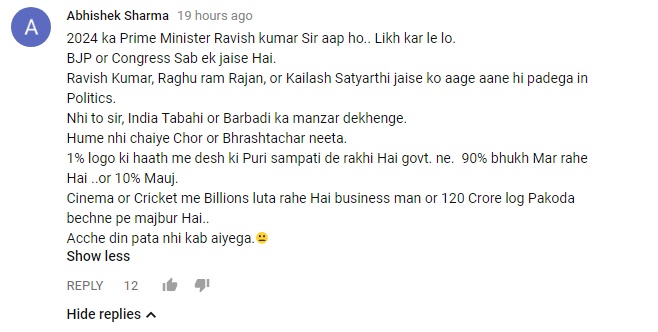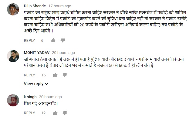 वीडियो में उन्होंने लट्टू कामत (रेहड़ी वाले) से पूछा है क्या वह अपने 15 साल पुराने रोजगार से खुश है? जिसके जवाब में कामत ने कहा कि इस रोजगार वह खुश कैसे रह सकते हैं! उनके रोजगार को मजबूरी में करने वाला काम कहा जाए तो गलत नहीं होगा। कामत ने आगे बताया कि जब निगम के लोग आते हैं तो वह अपना सारा सामान लेकर भाग जाते हैं। इसपर पत्रकार ने सवाल पूछा कि जब प्रधानमंत्री बात करते हैं कि पकौड़ा बनाने में शर्म किस बात की? पत्रकार ने दूसरा सवाल पूछा कि क्या कामत के बच्चे भी पकौड़ा रोजगार से जुड़ेंगे? इस दौरान उन्होंने एक सवाल यह भी पूछा कि पकौड़े प्याज के अच्छे होते हैं या आलू के?