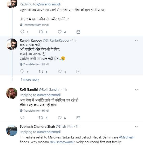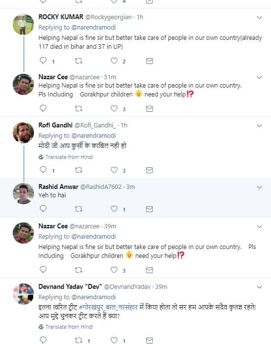 देश के प्रधानमंत्री नरेंद्र मोदी ने नेपाल में बाढ़ से मची तबाही पर अपनी संवेदना व्यक्त करते हुए कहा है कि इस संकट की घड़ी में भारत नेपाल के साथ कंधे से कंधा मिलाकर खड़ा है। प्रधानमंत्री ने ट्वीट करते हुए बताया कि मैंने नेपाल के प्रधानमंत्री शेर बहादुर देउबा से बात की और वहां इस विनाशकारी बाढ़ में मारे गए लोगों के प्रति अपनी संवेदना जताई। पीएम मोदी ने लगातार 2 ट्वीट कर नेपाल के हालात पर अपनी चिंता जाहिर की है। प्रधानमंत्री के इस ट्वीट पर बहुत से यूजर्स ने उनकी आलोचना करनी शुरू कर दी। ऐसे यूजर्स लिख रहे हैं कि आपको नेपाल की चिंता है ये बहुत अच्छी बात है लेकिन एक बार अपने देश में बाढ़ से मर रहे लोगों के प्रति भी संवेदना व्यक्त कर देते। वहीं कुछ यूजर्स ने लिखा कि बिहार में बाढ़ से इतने लोग मर गए और आपने एक बार भी दुख जाहिर नहीं किया और अब नेपाल के लिए कर रहे हैं। आपको बता दें कि बिहार के 13 जिलों में बाढ़ की स्थिति गंभीर बनी हुई है। बाढ़ का पानी नए क्षेत्रों में प्रवेश कर रहा है। बाढ़ की चपेट में आने से मरने वालों की संख्या बढ़कर 56 हो गई है, जबकि राज्य के करीब 70 लाख लोग बाढ़ से प्रभावित हुए हैं।