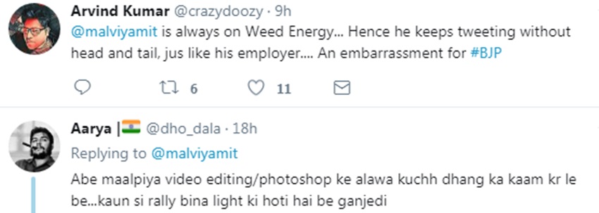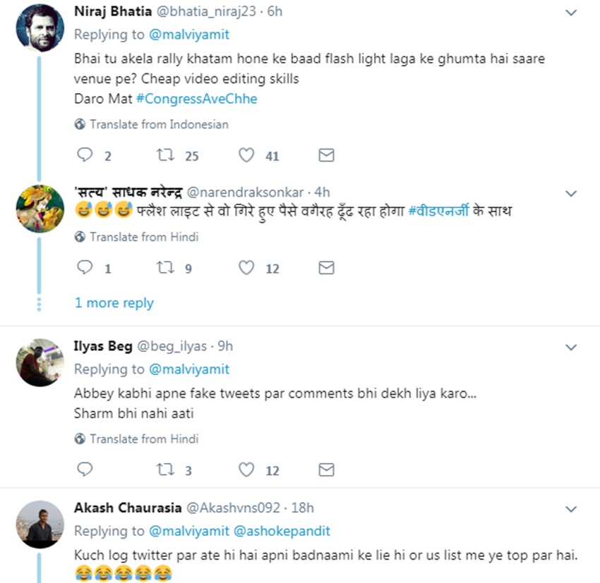 भाजपा आईटी सेल के मुखिया अमित मालवीय को कांग्रेस उपाध्यक्ष राहुल गांधी का मजाक उड़ाना महंगा पड़ा है। गुरुवार को उन्होंने एक वीडियो पोस्ट करते हुए राहुल पर निशाना साधा। लेकिन लोगों ने इस पर उल्टा उन्हीं के मजे ले लिए। लोगों ने उस वीडियो को एडिट किया हुआ बताया। इतना ही नहीं, उन्होंने मालवीय को ये सब करने के बजाय ढंग के काम करने की नसीहत दी। कहा कि कभी अपने ट्वीट्स में कमेंट्स भी पढ़ लिया करिए। मालवीय ने गुरुवार को एक ट्वीट किया। लिखा, “राहुल गांधी का सच।” उन्होंने उसके साथ 46 सेकेंड्स का वीडियो भी पोस्ट किया। यह क्लिप किसी कार्यक्रम स्थल की मालूम पड़ती है। वहां अंधेरा छाया होता है। ढेर सारी कुर्सियां दिखती हैं, जो खाली होती हैं। कैमरा आगे-पीछे, इधर-उधर जाकर नजारा दिखाया जाता है, मगर कोई नजर नहीं आता।