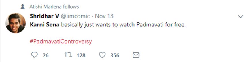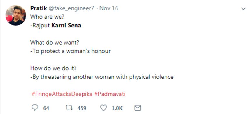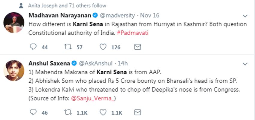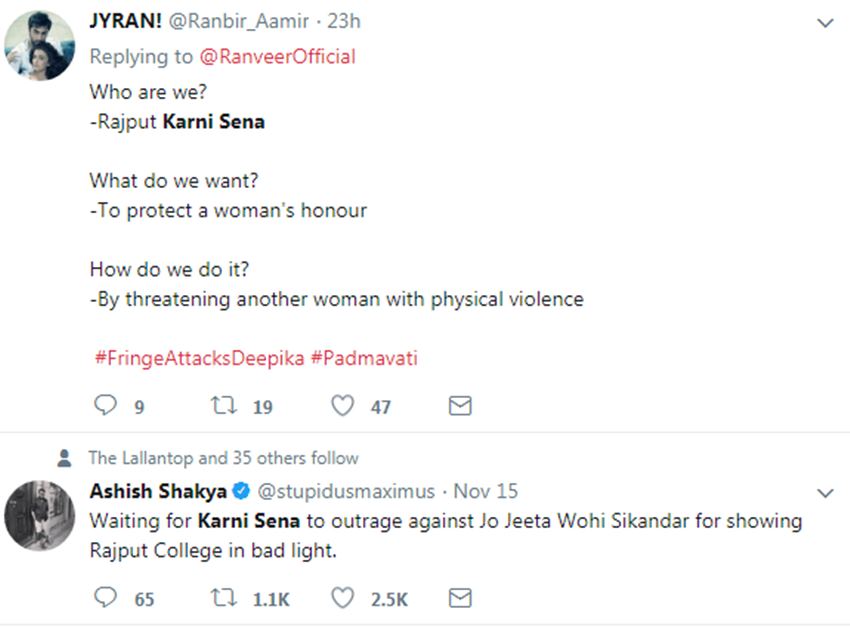 लोगों ने इस विवाद पर पूछा कि राजस्थान में करणी सेना और कश्मीर की हुर्रियत में क्या अंतर है? क्या वह अन्य महिलाओं को परेशान कर बाकी महिलाओं का सम्मान बरकरार रखेगी। या फिर वह मुफ्त में फिल्म देखना चाहती है? देखिए ऐसे ही ट्वीट्स-