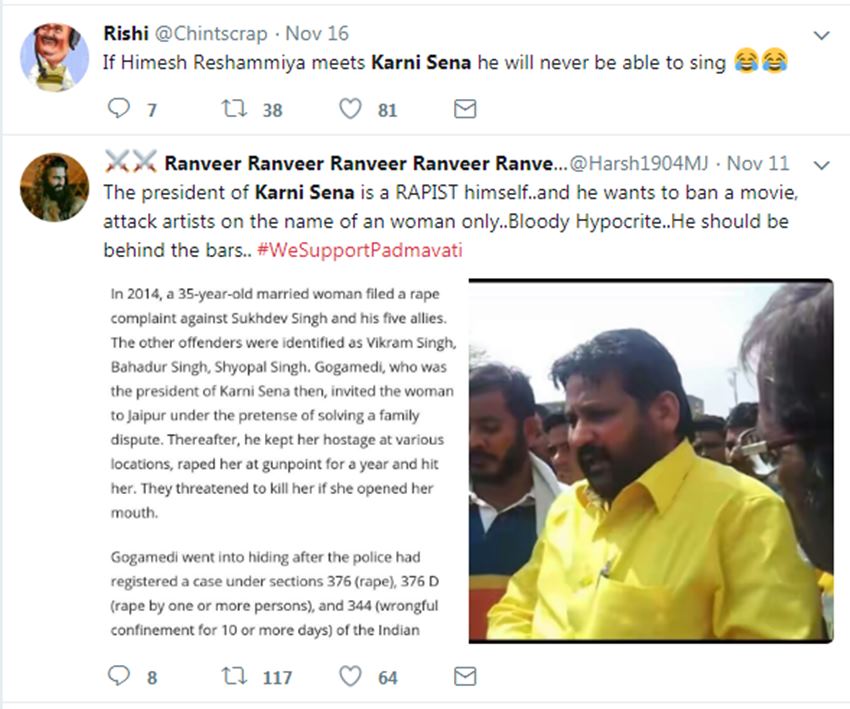 फिल्म पद्मावती को रिलीज होने में दो हफ्ते बचे हैं। लेकिन अभी भी इस पर राजनीति जारी है। विवाद सड़कों से लेकर सोशल मीडिया तक फैला हुआ है। देश के कई हिस्सों में फिल्म के विरोध को लेकर प्रदर्शन हुए। थियेटरों को आग के हवाले करने की चेतावनी जारी की गई। इतना ही नहीं, राजपूत करणी सेना ने फिल्म की लीड एक्ट्रेस दीपिका पादुकोण को उनकी नाक काटने की धमकी भी दी। टि्वटर पर इसी को लेकर करणी सेना यूजर्स के निशाने पर आ गई। कुछ ने उन पर सवाल खड़े किए तो कुछ ने ऐसा मजाक बनाया, जिसे देख आपकी भी हंसी छूट आएगी।