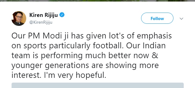 केंद्रीय गृह राज्य मंत्री किरेन रिजिजू ने फुटबॉल को लेकर प्रधानमंत्री नरेंद्र मोदी की जमकर तारीफ की, लेकिन इसी दौरान उनसे एक चूक हो गई। उन्होंने ब्राजीलियन बच्चे का एक वीडियो पोस्ट करते हुए उसे भारतीय बता दिया। दरअसल, खुद को फुटबॉल का बड़ा फैन बताने वाले रिजिजू ने पीएम मोदी की तारीफ करते हुए 30 जून को एक ट्वीट किया। इस ट्वीट में उन्होंने कहा पीएम मोदी इस देश में स्पोर्ट्स को बढ़ावा देने के लिए बहुत काम कर रहे हैं, विशेषकर फुटबॉल के लिए उन्होंने काफी कुछ किया। रिजिजू ने लिखा, ‘हमारी इंडियन टीम अब काफी अच्छा प्रदर्शन कर रही है और आने वाली पीढ़ी भी इस खेल में इंटरेस्ट दिखा रही है। मुझे काफी उम्मीद है।’