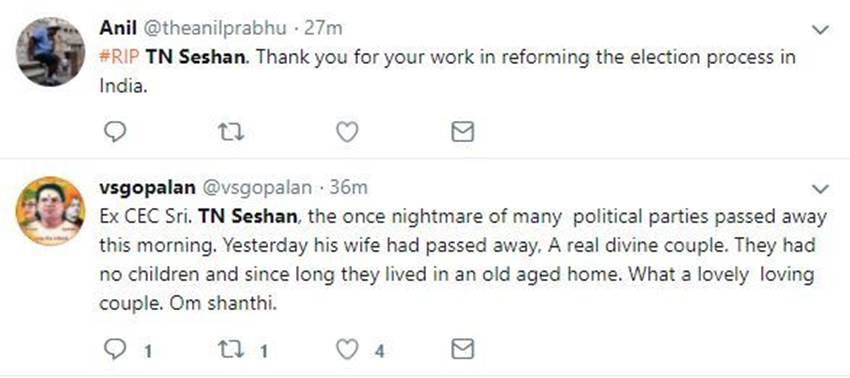 काफी समय से शेषन अपनी अपनी पत्नी के साथ चेन्नई के एक वृद्धाश्रम में रह रहे थे। बीते साल 15 दिसंबर को वृद्धाश्रम में टीएन शेषन का 85वां जन्मदिन भी मनाया गया था। पिछले दिनों सोशल मीडिया पूर्व प्रधानमंत्री अटल बिहारी वाजपेयी की मौत की अफवाहों ने भी जोर पकड़ा था। बता दें कि टीएन शेषन 1955 बैच के आईएएस अधिकारी रहे हैं। वह 1990 से 1996 तक देश के मुख्य चुनाव आयुक्त भी रहे हैं। शेषन कठोर निर्णयों और कई सुधारों को लेकर जाने जाते हैं।