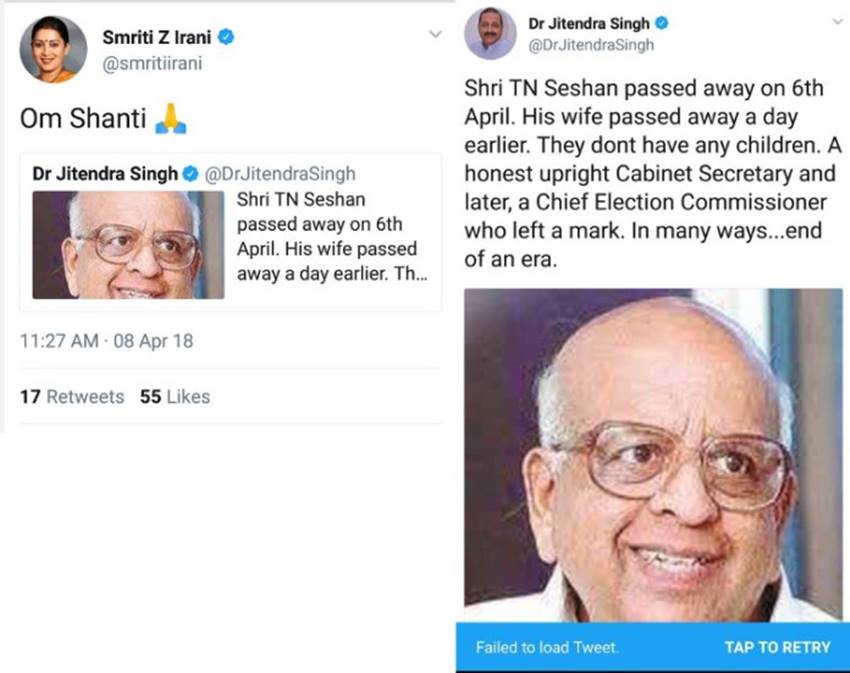 भारत के पूर्व मुख्य चुनाव आयुक्त टीएन शेषन के निधन की अवफाह के शिकार कई दिनों के बाद भारत सरकार के दो बड़े मंत्री भी हो गए। केंद्रीय सूचना व प्रसारण और कपड़ा मंत्री स्मृति ईरानी और केंद्रीय राज्य मंत्री (स्वतंत्र प्रभार) जितेंद्र सिंह ने टीएन शेषन की मौत की अफवाह पर ट्वीट कर श्रद्धांजलि दे डाली। हालांकि दोनों ने ट्वीट हटा लिए। स्मृति ईरानी ने जितेंद्र सिंह के ट्वीट को रीट्वीट कर दुख जताया था। जितेंद्र सिंह ने ट्वीट में लिखा- ”श्री टीएन शेषन का 6 अप्रैल को निधन हो गया। उनकी पत्नी का एक दिन पहले निधन हो गया था। उनके बच्चे नहीं हैं। एक ईमानदार कैबिनेट सचिव और बाद में मुख्य चुनाव आयुक्त रहकर उन्होंने कई मिसालें कायम कीं, कई तरह से यह एक युग का खत्म होना है।” स्मृति ईरानी ने ट्वीट में लिखा- ”ओम शांति।” बता दें कि 31 मार्च को टीएन शेषन की पत्नी जयलक्ष्मी शेषन का निधन हो गया था। लेकिन कुछ शरारती तत्वों ने सोशल मीडिया पर टीएन शेषन की मौत की अफवाह फैलाकर झूठी श्रद्धांजलि दे डाली।