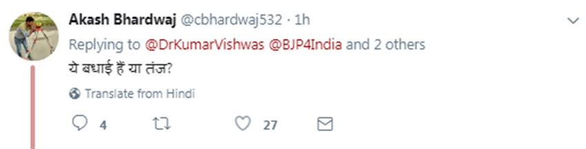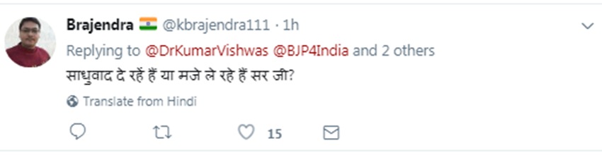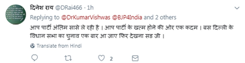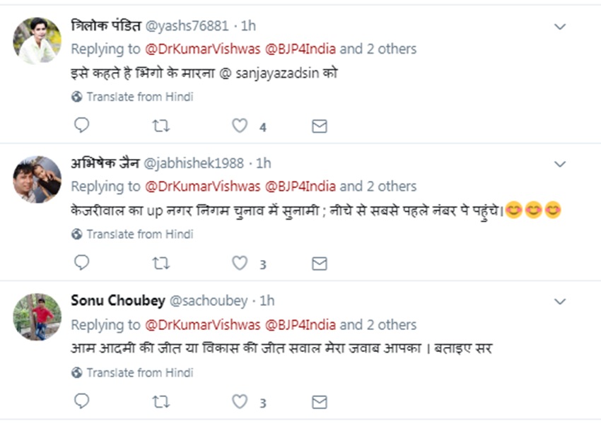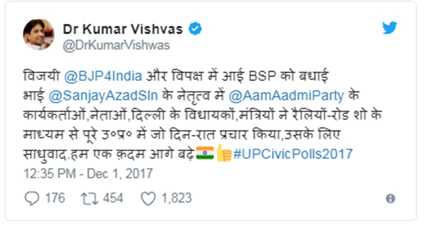 नगर निगम के अलावा नगर पालिका और नगर पंचायत में भी झाड़ू कुछ खास कमाल नहीं दिखा सकी। ऐसे में राजनीतिक मामलों के जानकार इसे कुमार के तगड़े तंज के रूप में देख रहे हैं। सूत्रों की मानें, तो विश्वास और आप के कुछ नेताओं में काफी दिनों से मनमुटाव था। यह यत इससे समझी जा सकती है कि यूपी का होने के बावजूद उन्हें यहां निकाय चुनाव के दौरान प्रचार के लिए नहीं उतारा गया।