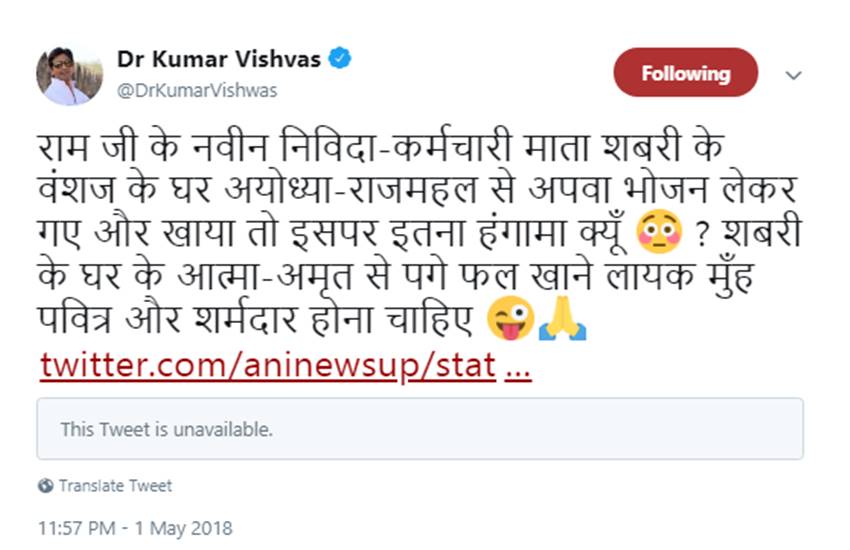 ताजा मामले में आप से खफा नेता ने इस बाबत सोमवार (1 मई) को एक ट्वीट किया। उन्होंने लिखा, “राम जी के नवीन निविदा-कर्मचारी माता शबरी के वंशज के घर अयोध्या-राजमहल से अपना भोजन लेकर गए और खाया तो इस पर इतना हंगामा क्यों? शबरी के घर के आत्मा-अमृत से पगे फल खाने लायक मुंह पवित्र और शर्मदार होना चाहिए।”