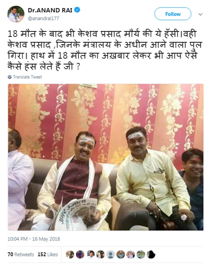 बुधवार (16 मई) को इसी घटना से जुड़ा मौर्य का फोटो टि्वटर पर वायरल हो रहा था। डॉ.आनंद राय ने अपने टि्वटर हैंडल से लिखा, “18 मौत के बाद भी मौर्य की ये हंसी। वही मौर्य, जिनके मंत्रालय के अधीन आने वाला पुल गिरा। हाथ में 18 मौत का अखबार लेकर भी आप ऐसे कैसे हंस लेते हैं जी?”