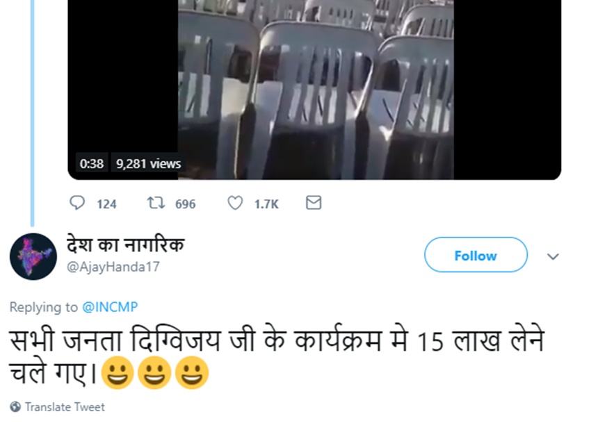 इस वीडियो  पर लोगों ने काफी मजेदार कमेंट लिखे हैं। देश का नागरिक नामक एक ट्विटर हैंडल से लिखा गया है। सभी जनता दिग्विजय जी के कार्यक्रम मे 15 लाख लेने चले गए हैं।वहीं, विजेंद्र जी नामक एक यूजर ने लिखा है-जैसी कुर्सियां खाली दिख रही हैं वैसे ही लोक सभा मे मोदी की भाजपा गायब होती दिखेगी।
