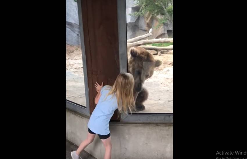 चिड़िया घर में भालू के साथ खेलते हुए 6 साल की एक बच्ची का वीडियो सोशल मीडिया पर काफी पसंद किया जा रहा है। ये वीडियो साउथ कैरोलिना के कोलंबिया में रिवरसाइड नाम के एक जू के अंदर का है। वीडियो में 6 साल की रिले शीशे के पार नजर आ रहे एक भालू के साथ आंखमिचौली का खेल खेल रही है। अंग्रेजी में इस खेल को पीक-अ-बू भी कहा जाता है। वीडियो में नजर आ रहा है कि रिले शीशे के इस पार एक खंभे के पीछे खड़ी है। वो कभी खंभे के दाहिने तरफ से अपना सिर निकालती है तो कभी बाइं तरफ से। इस वीडियो में मजेदार बात ये रही कि शीशे के पार खड़ा भालू भी रिले के इशारे पर सिर इधर-उधर कर रहा है। जब रिले दाहिने तरफ सिर करती है तो वो भालू भी दाहिने तरफ देखता है औऱ जब रिले बाईं तरफ सिर करती है तो भालू भी बाईं तरफ करता है।