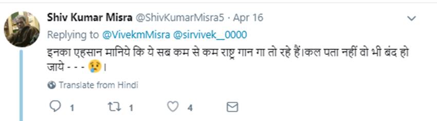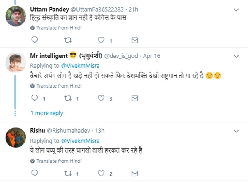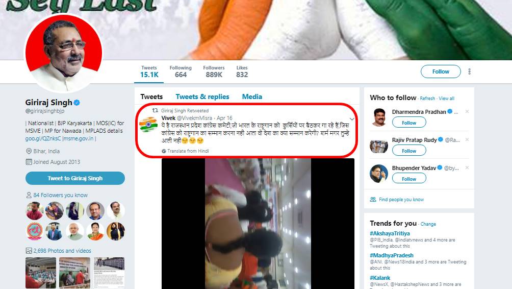 हुआ यूं कि सोमवार (16 अप्रैल) को विवेक मिश्रा नाम के अकाउंट से इस वीडियो को ट्वीट किया गया। वीडियो के साथ इसमें लिखा था, “यह है राजस्थान प्रदेश कांग्रेस कमेटी, जो भारत के राष्ट्रगान को कुर्सियों पर बैठ कर गाती है। जिस कांग्रेस को राष्ट्रगान का सम्मान करना नहीं आता, वह देश का सम्मान कैसे करेगी? मगर तुम्हें (कांग्रेस पार्टी को) शर्म नहीं आती।”