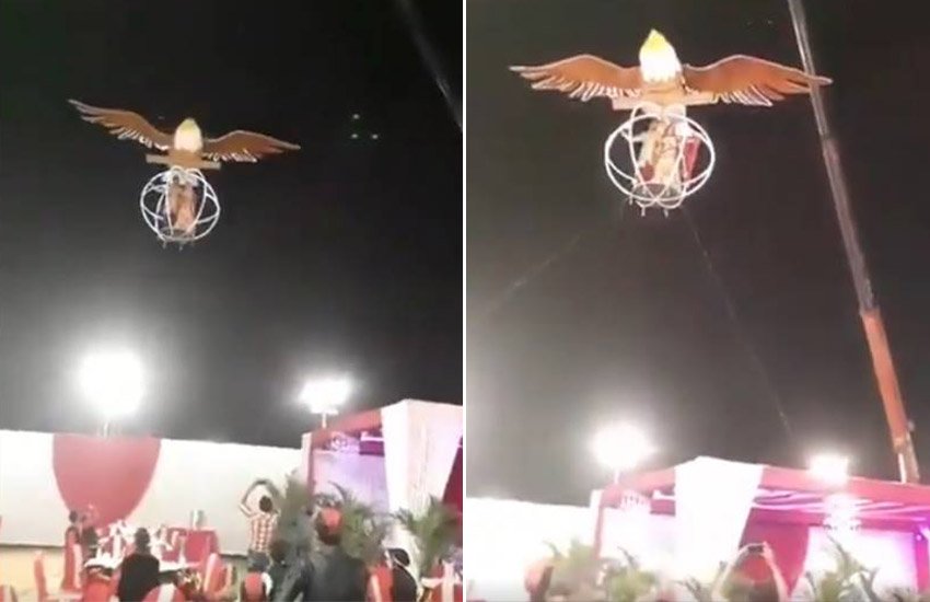 आपने अब तक कई शादियां और पार्टियां देखी होंगी। लेकिन सोशल मीडिया पर इस वक्त एक फंक्शन का जो वीडियो वायरल हुआ है उसे देखकर आप दंग रह जाएंगे। इस शनदार फंक्शन में नवविवाहित जोड़ा बाज के पंजों में लटक कर मंडप तक पहुंचते हैं। बाज के पंजों में लटके इस जोड़े का वीडियो हैरान करने वाला है। फंक्शन में आए मेहमान इस जोड़े के स्टेज पर आने का इंतजार कर रहे थे। तभी अचानक कई फीट की ऊंचाई पर बांज के पंजे में लटका यह जोड़ा पार्टी में शानदार एंट्री मारता है। इस एंट्री को देख कर मेहमानों की आंखें फटी की फटी रह जाती है। वीडियो में नजर आ रहा है कि एक क्रेन के सहारे यह लोग एक आर्टिफिशयल बाज के पंजों में लटके हुए हैं। धीरे-धीरे हवा में लहराते हुए वो जमीन पर उतरते हैं।