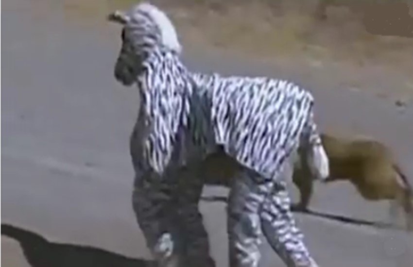 दरअसल इस वीडियो में दो शख्स बड़ी ही अजीब हरकत करते हैं। किसी जंगली जानवर या एडवेंचर सफारी पर जाने में कोई आम आदमी कई सावधियां बरतता है लेकिन इन दोनों को इसकी परवाह नहीं। ये दोनों एक जेबरा सूट पहनकर, जंगली जानवरों के बीच निकल पड़ते हैं। एक जेबरासूट में यह दोनों काफी हद तक जेबरा जैसे ही नजर आ रहे है। इन्हें देखते ही कई जंगली जानवर दूर भागते हुए वीडियो में नजर आएंगे। लेकिन दूसरी तरफ शेरनियों का एक झुंड इनकी तरफ बढ़ने लगता है। दो शेरनियां इन्हें जेबरा कॉस्ट्यूम में देखकर अपना शिकार समझ लेती हैं। दोनों शेरनियां इन्हें दबोचने की कोशिश भी करती हैं लेकिन खुशकिस्मती से ये दोनों भागने में कामयाब रहते हैं। बाकी वीडियो में क्या हुआ यह आप आगे खुद देखिए।