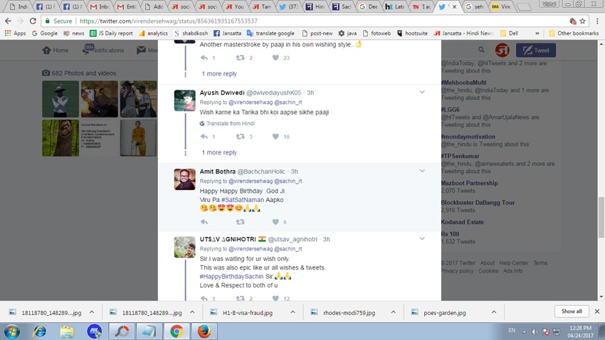 वीरेंद्र सहवाग के साथ क्रिकेट की और भी हस्तियों ने सचिन को उनके जन्मदिन पर बधाई दी है। आर अश्विन ने ट्वीट किया, ’24 अप्रैल को भारतीय क्रिकेट दिवस के तौर पर मनाया जाना चाहिए। मैं लकी हूं कि मुझे उनके साथ खेलने का मौका मिला।’