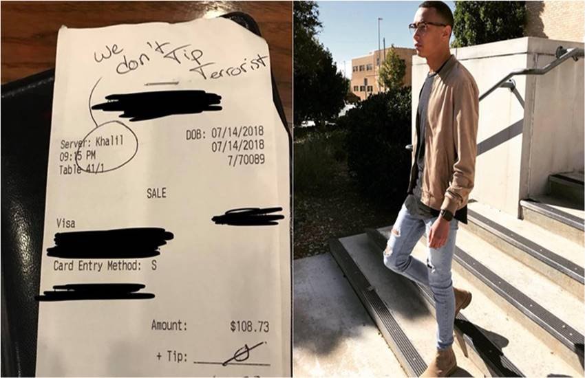 अमेरिका के टेक्सास में धर्मभेद का मामला सामने आय़ा है। यहां एक रेस्टुरेंट में एक ग्राहक ने वेटर को सिर्फ इसलिए टिप देने से इनकार कर दिया क्योंकि ग्राहक को लगा कि वेटर एक मुसलमान है। इस कस्टमर ने बिल में यह भी लिख दिया कि – ‘मैं आतंकियों को टिप नहीं देता।’ इस वेटर ने सोशल मीडिया साइट फेसबुक पर अपने पोस्ट के जरिए इस कहानी को उजागर किया है। इस वेटर ने बिल का फोटो भी सोशल मीडिया पर लगाया है। सोशल मीडिया पर यह पोस्ट तेजी से वायरल भी हो रहा है। जानकारी के मुताबिक खलील कैविल ओडिशन टेक्सास के साल्टग्रास स्टीक हाउस में बतौर वेटर काम करते हैं। बीते 15 जुलाई की रात को इस रेस्टरेंट में एक कस्टमर ने खाना खाया। इस कस्टमर का बिल 108 डॉलर हुआ था।