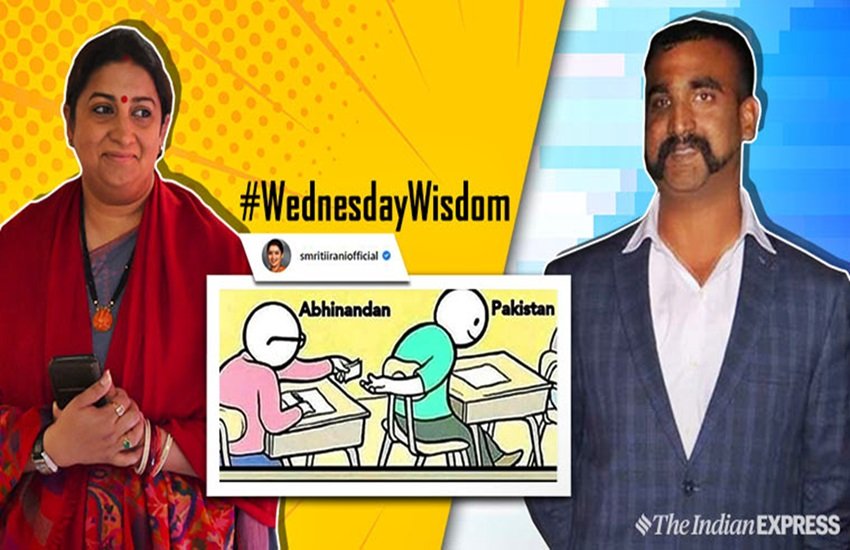 केंद्रीय मंत्री स्मृति ईरानी ने अपने इंस्टाग्राम पर एक पोस्ट किया है। जो काफी ज्यादा सुर्खियां बटोर रहा है। साथ ही इस पोस्ट को काफी शेयर भी किया जा रहै है। बता दें कि ये पोस्ट भारतीय वायु सेना के विंग कमांडर अभिनंदन वर्तमान से जुड़ा है। साथ ही पोस्ट से पाकिस्तान पर तंज भी कसा गया है। पोस्ट को स्मृति ईरानी ने हैशटैग वेडनसडेविजडम (#WednesdayWisdom) के साथ शेयर किया है।