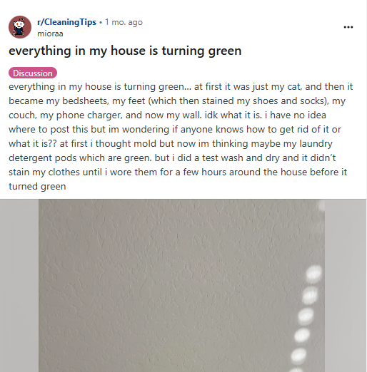 महिला ने सबूत के तौर पर हरे रंग की वस्तुओं की तस्वीरें पोस्ट कीं। शुरू में उसे लगा कि यह फफूंद हैं जो उसके घर को हरा कर रही हैं, और बाद में उसने सोचा कि ये उसके कपड़े धोने के डिटर्जेंट की वजह से भी हो सकता है, लेकिन आगे की जांच के बाद दोनों ही सिद्धांत खारिज हो गए।