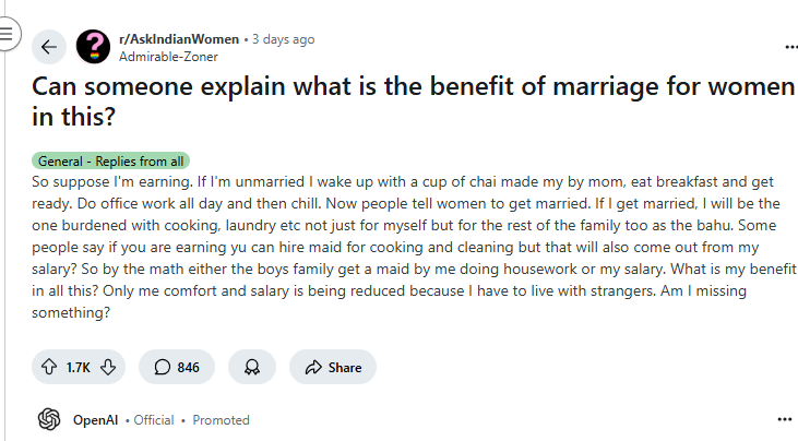 एक तीसरे उपयोगकर्ता ने लिखा, “इन सभी हैपी एंडिंग वाले जवाबों पर विश्वास न करें। आपका आकलन बिल्कुल सही है। यह उन कामकाजी महिलाओं के लिए बहुत बड़ी यातना है जो विवाहित हैं और अपने ससुराल वालों के साथ रहती हैं। उनकी चीखें खामोश रहती हैं और ज़्यादातर समय अनसुनी रह जाती हैं। सिंगल होने से मिलने वाली शांति अपूरणीय है।”