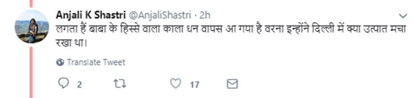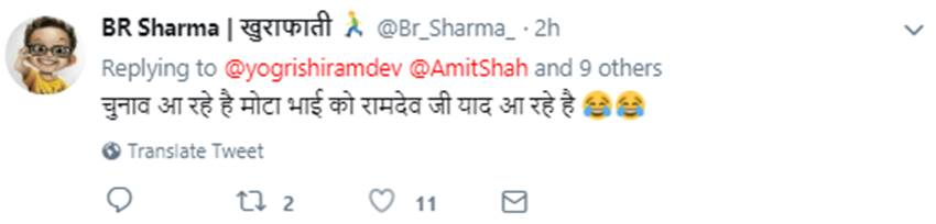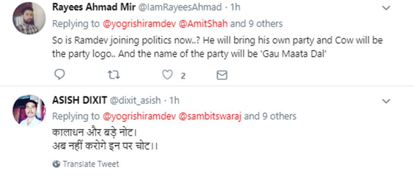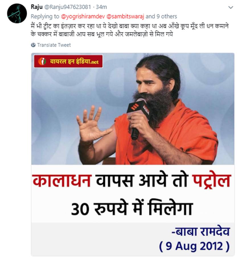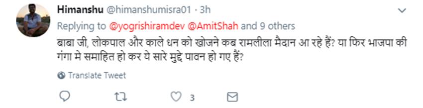 योग गुरु बाबा रामदेव ने प्रधानमंत्री नरेंद्र मोदी की सरकार को लेकर ट्वीट किया। उन्होंने सरकार की कुछ उपलब्धियां गिनाई थीं, जिनके कारण वह ट्रोल्स के निशाने पर आ गए। सोशल मीडिया यूजर्स इसी को लेकर न केवल उन पर हमलावर नजर आए, बल्कि लोगों ने बीजेपी सरकार की भी आलोचना की। लोगों का कहना था कि आप (रामदेव) जब स्वदेशी की बात करते हैं, तो टि्वटर क्यों चलातें हैं? यह तो अमेरिकी है। एक अन्य शख्स ने पूछा कि बाबा जी, लोकपाल-काला धन को खोजने कब रामलीला मैदान आ रहे हैं? या फिर बीजेपी की गंगा में समाहित होकर ये सारे मुद्दे पावन हो गए?